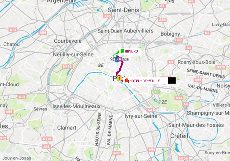 Il n'y a pas de ligne de métro directe entre les stations Anvers et Hôtel de Ville. Le trajet est effectué en 2 correspondances entre les lignes : ligne