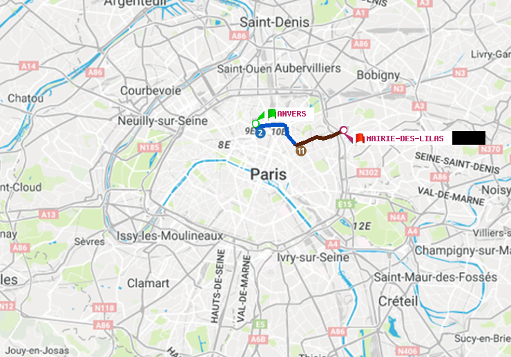 Il n'y a pas de ligne de métro directe entre les stations Anvers et Mairie des Lilas. Le trajet est effectué avec une correspondances entre les lignes