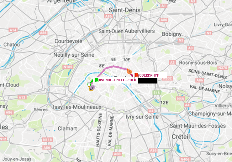 Il n'y a pas de ligne de métro directe entre les stations Avenue Emile-Zola et Oberkampf. Le trajet est effectué en 2 correspondances entre les lignes : ligne