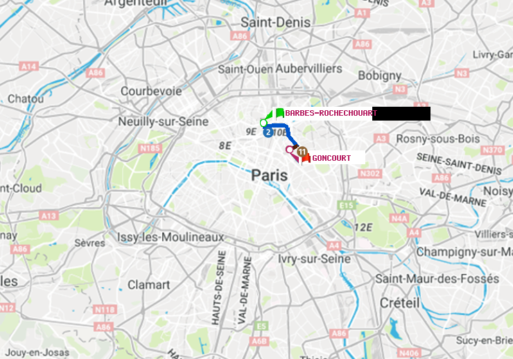 A : Barbès-Rochechouart | B : Goncourt (Hôpital Saint-Louis)