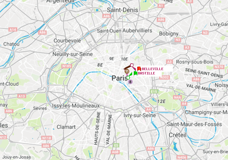 Plan de l'itinéraire métro de Bastille vers Belleville