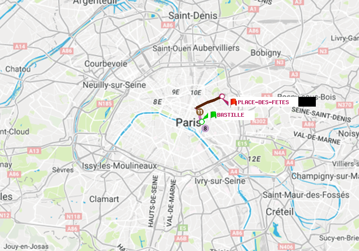 Itinéraire en métro parisien de Bastille vers Place des Fêtes