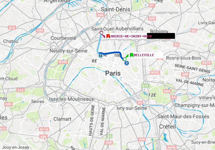 Itinéraire en métro parisien de Belleville vers Mairie de Saint-Ouen