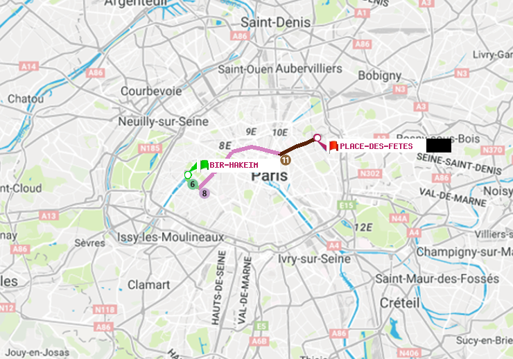 A : Bir-Hakeim (Grenelle) | B : Place des Fêtes