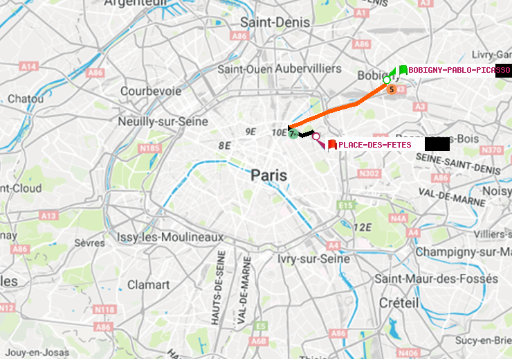 Itinéraire en métro parisien de Bobigny-Pablo-Picasso vers Place des Fêtes