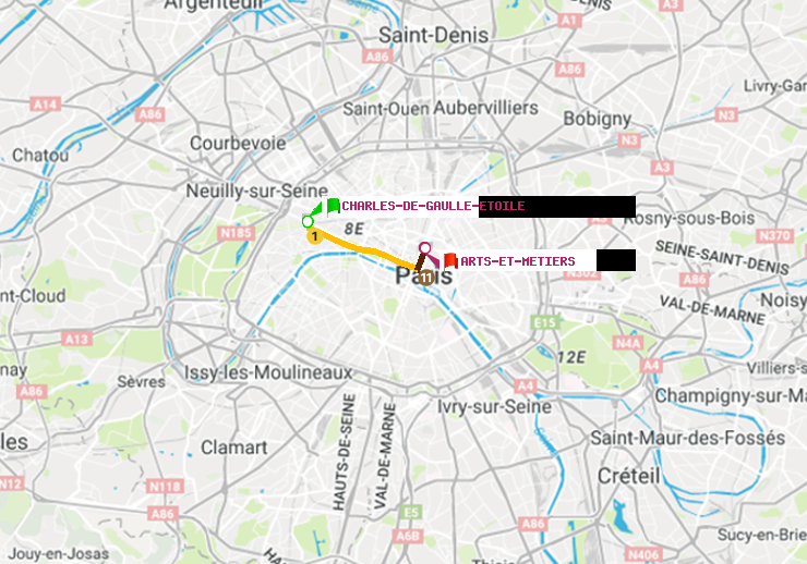 Il n'y a pas de ligne de métro directe entre les stations Charles de Gaulle-Etoile et Arts-et-Métiers. Le trajet est effectué avec une correspondances entre les lignes
