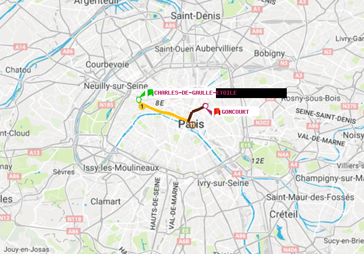 Il n'y a pas de ligne de métro directe entre les stations Charles de Gaulle-Etoile et Goncourt (Hôpital Saint-Louis). Le trajet est effectué avec une correspondances entre les lignes