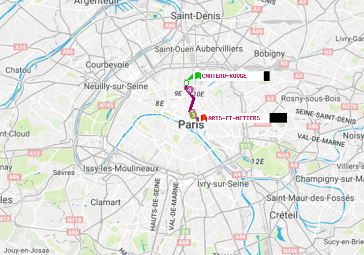 Il n'y a pas de ligne de métro directe entre les stations Château Rouge et Arts-et-Métiers. Le trajet est effectué avec une correspondances entre les lignes