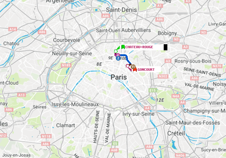 Il n'y a pas de ligne de métro directe entre les stations Château Rouge et Goncourt (Hôpital Saint-Louis). Le trajet est effectué en 2 correspondances entre les lignes : ligne