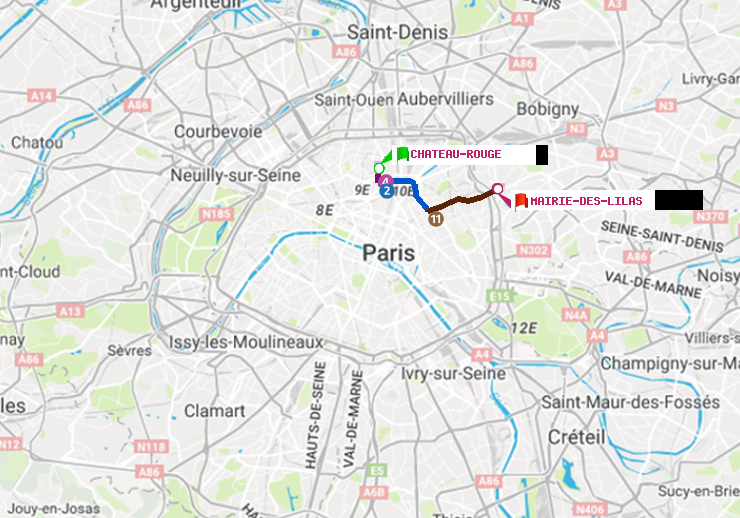 Il n'y a pas de ligne de métro directe entre les stations Château Rouge et Mairie des Lilas. Le trajet est effectué en 2 correspondances entre les lignes : ligne
