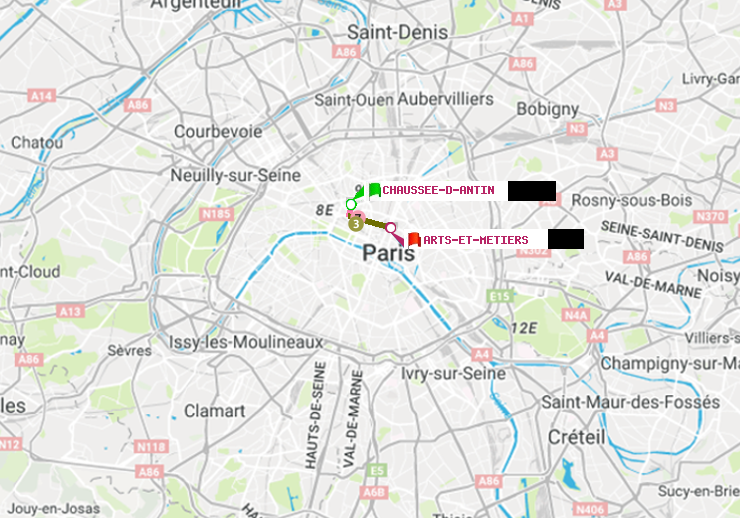 Il n'y a pas de ligne de métro directe entre les stations Chaussée d'Antin (La Fayette) et Arts-et-Métiers. Le trajet est effectué avec une correspondances entre les lignes