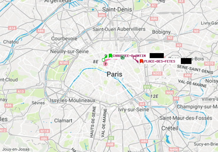 Il n'y a pas de ligne de métro directe entre les stations Chaussée d'Antin (La Fayette) et Place des Fêtes. Le trajet est effectué avec une correspondances entre les lignes
