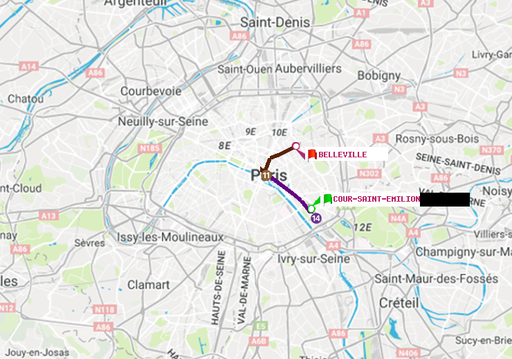 Itinéraire en métro parisien de Cour Saint-Emilion vers Belleville