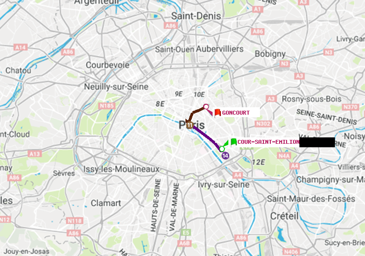 Feuille de route en métro (Cour Saint-Emilion -> Goncourt (Hôpital Saint-Louis))