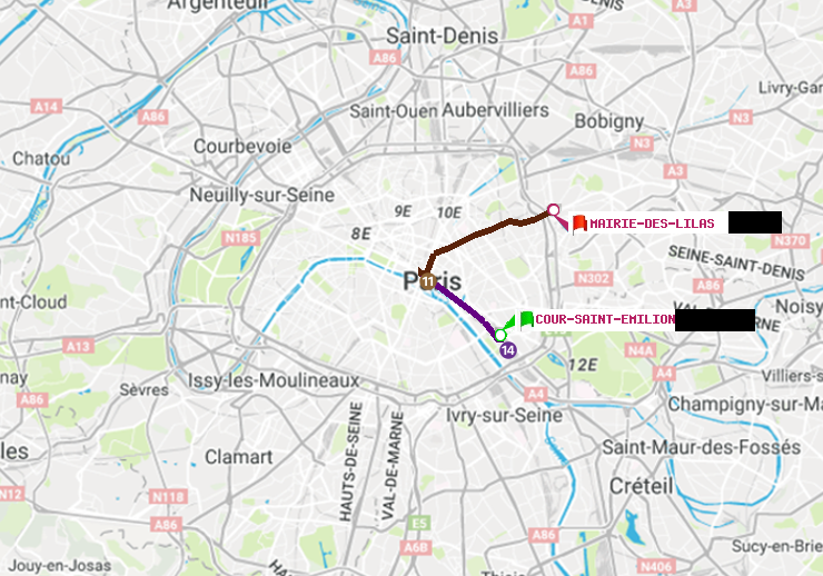 Plan de l'itinéraire métro de Cour Saint-Emilion vers Mairie des Lilas