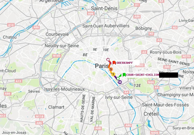 Il n'y a pas de ligne de métro directe entre les stations Cour Saint-Emilion et Oberkampf. Le trajet est effectué en 2 correspondances entre les lignes : ligne