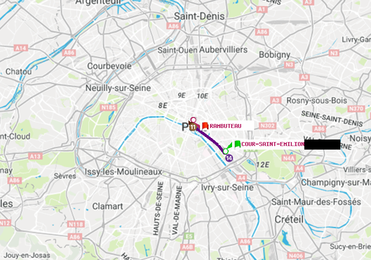 Plan de l'itinéraire métro de Cour Saint-Emilion vers Rambuteau