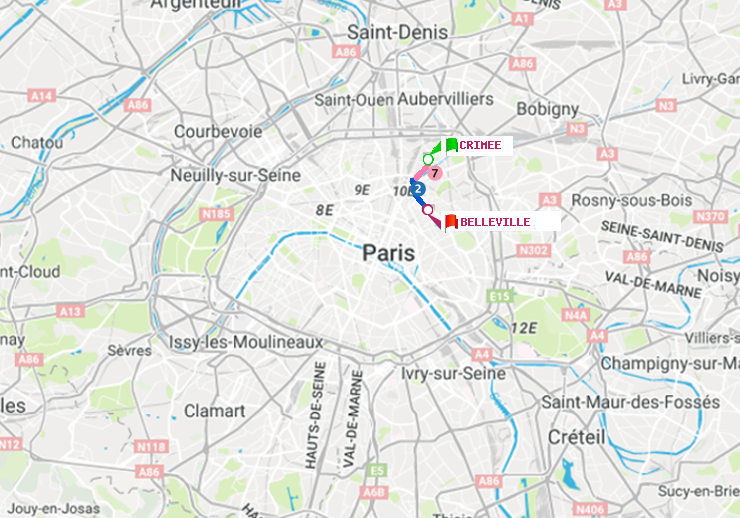 Plan de l'itinéraire métro de Crimée vers Belleville
