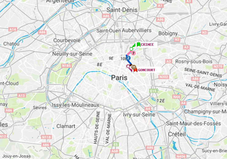Il n'y a pas de ligne de métro directe entre les stations Crimée et Goncourt (Hôpital Saint-Louis). Le trajet est effectué en 2 correspondances entre les lignes : ligne
