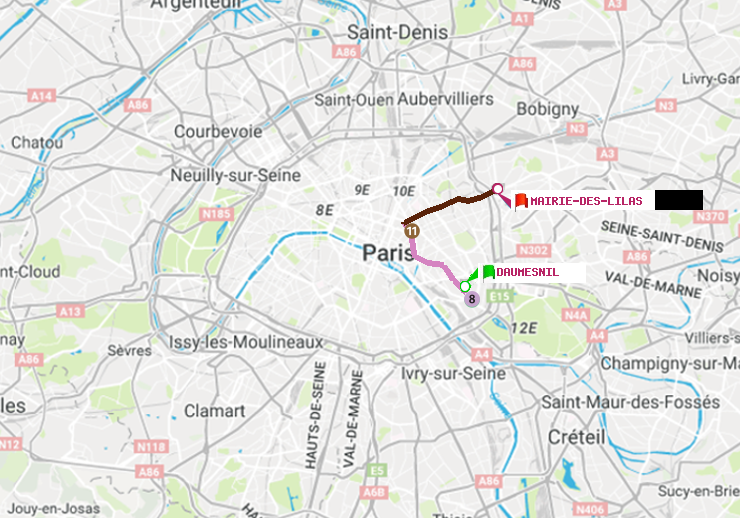 Il n'y a pas de ligne de métro directe entre les stations Daumesnil (Félix Eboué) et Mairie des Lilas. Le trajet est effectué en 2 correspondances entre les lignes : ligne