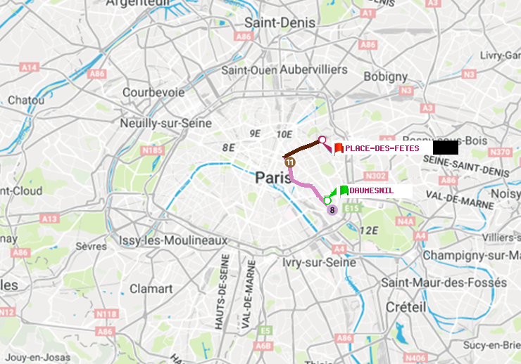 Il n'y a pas de ligne de métro directe entre les stations Daumesnil (Félix Eboué) et Place des Fêtes. Le trajet est effectué avec une correspondances entre les lignes