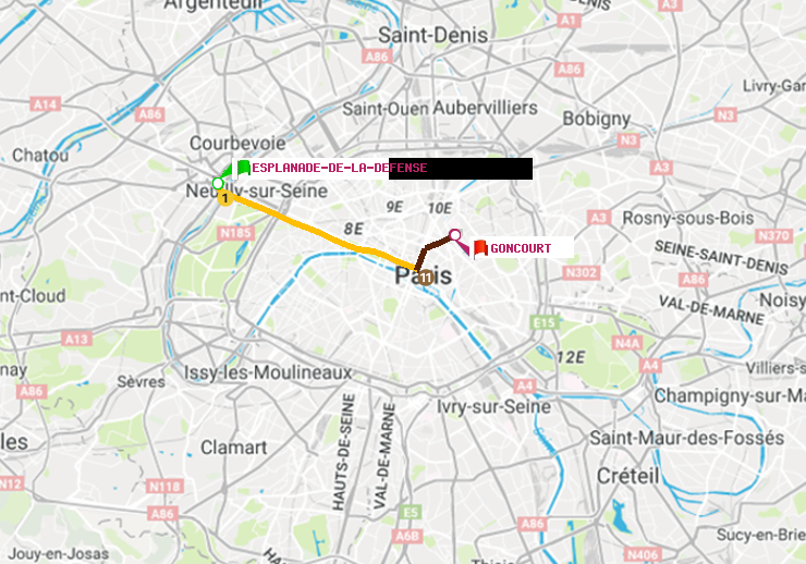 Il n'y a pas de ligne de métro directe entre les stations Esplanade de la Défense et Goncourt (Hôpital Saint-Louis). Le trajet est effectué avec une correspondances entre les lignes