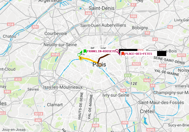 Itinéraire en métro parisien de Franklin-Roosevelt vers Place des Fêtes