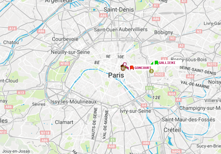 A : Gallieni (Parc de Bagnolet) | B : Goncourt (Hôpital Saint-Louis)