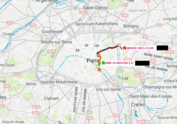 A : Gare d'Austerlitz | B : Mairie des Lilas