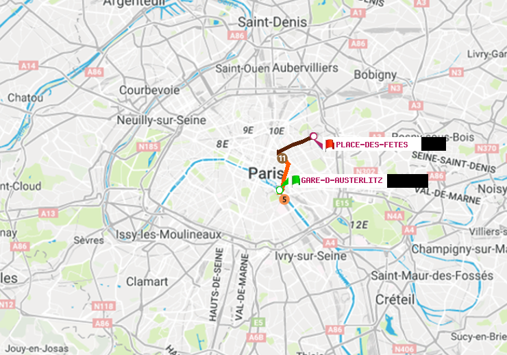 Feuille de route en métro (Gare d'Austerlitz -> Place des Fêtes)