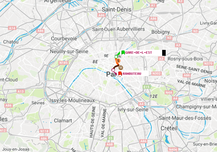 Il n'y a pas de ligne de métro directe entre les stations Gare de l'Est (Verdun) et Rambuteau. Le trajet est effectué avec une correspondances entre les lignes