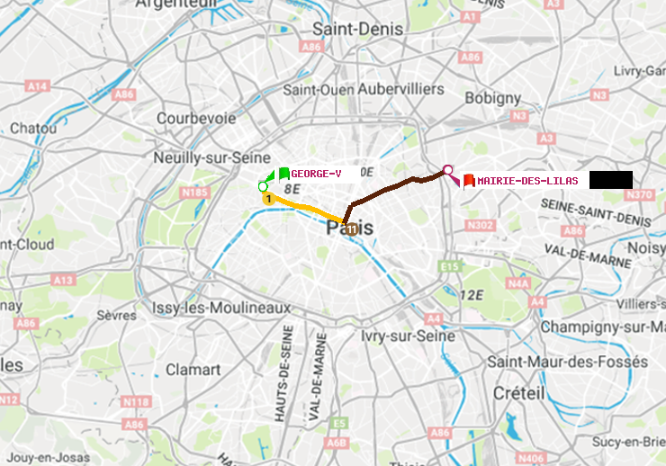 Il n'y a pas de ligne de métro directe entre les stations George V et Mairie des Lilas. Le trajet est effectué avec une correspondances entre les lignes