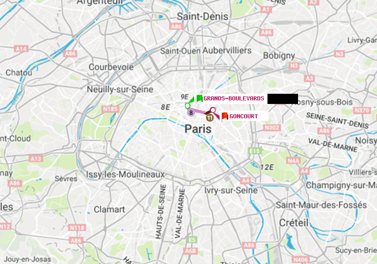 Il n'y a pas de ligne de métro directe entre les stations Grands Boulevards et Goncourt (Hôpital Saint-Louis). Le trajet est effectué avec une correspondances entre les lignes