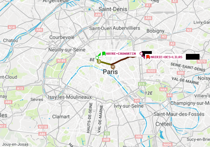 Il n'y a pas de ligne de métro directe entre les stations Havre-Caumartin et Mairie des Lilas. Le trajet est effectué avec une correspondances entre les lignes