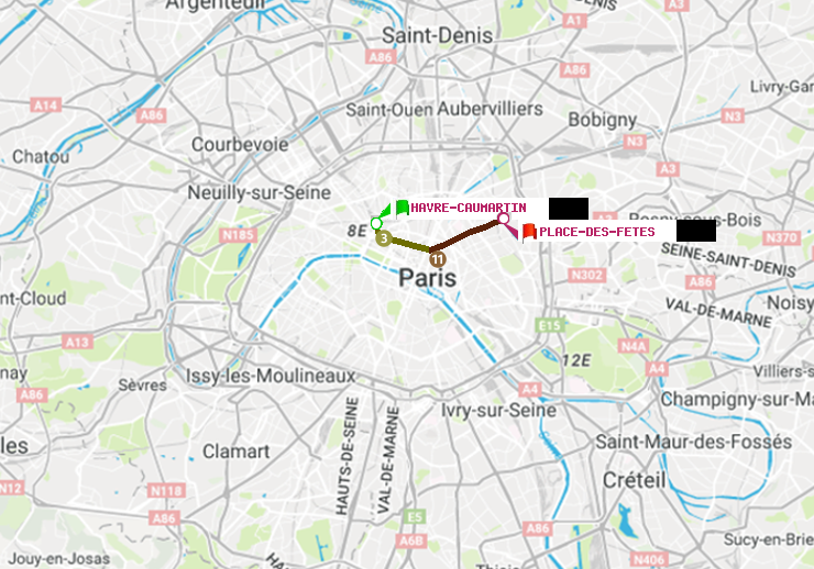 Il n'y a pas de ligne de métro directe entre les stations Havre-Caumartin et Place des Fêtes. Le trajet est effectué avec une correspondances entre les lignes