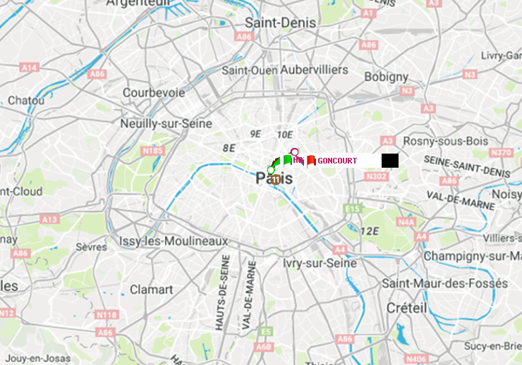 Plan de l'itinéraire métro de Hôtel de Ville vers Goncourt (Hôpital Saint-Louis)