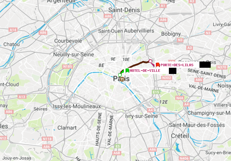 Plan de l'itinéraire métro de Hôtel de Ville vers Porte des Lilas