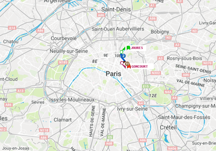 Il n'y a pas de ligne de métro directe entre les stations Jaurès et Goncourt (Hôpital Saint-Louis). Le trajet est effectué avec une correspondances entre les lignes