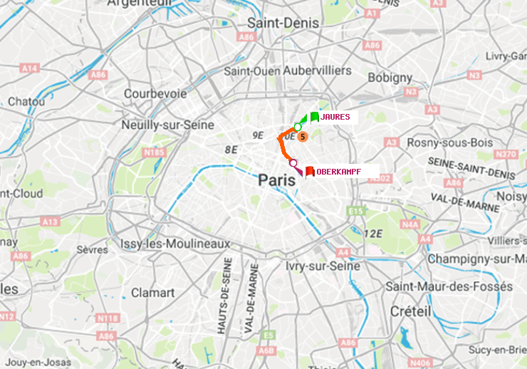 Itinéraire en métro parisien de Jaurès vers Oberkampf