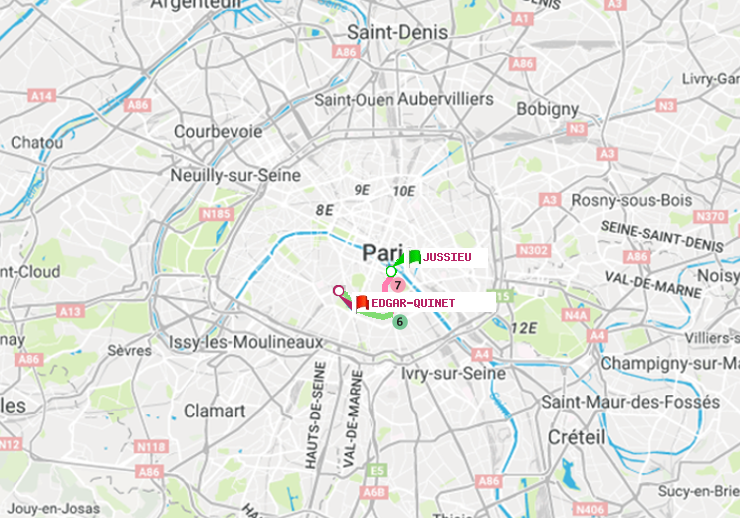 Il n'y a pas de ligne de métro directe entre les stations Jussieu et Edgar-Quinet. Le trajet est effectué avec une correspondances entre les lignes
