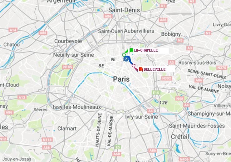Plan de l'itinéraire métro de La Chapelle vers Belleville
