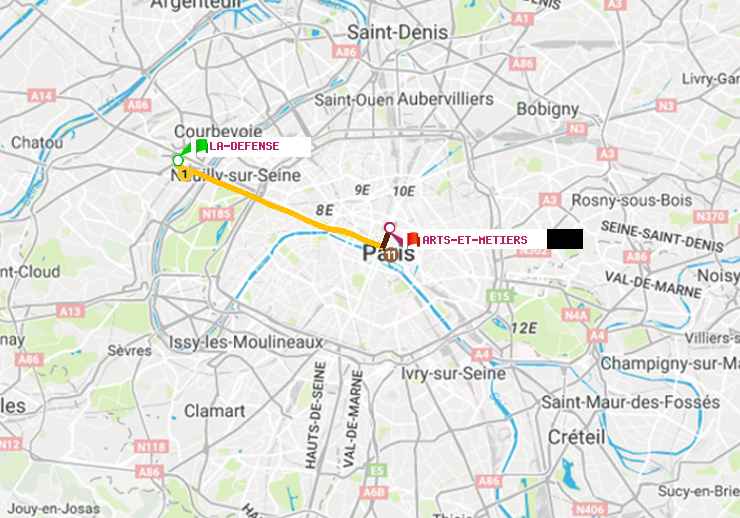 Plan de l'itinéraire métro de La Défense (Grande Arche) vers Arts-et-Métiers