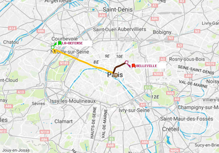Plan de l'itinéraire métro de La Défense (Grande Arche) vers Belleville