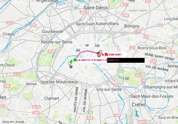 Il n'y a pas de ligne de métro directe entre les stations La Motte-Picquet-Grenelle et Goncourt (Hôpital Saint-Louis). Le trajet est effectué avec une correspondances entre les lignes