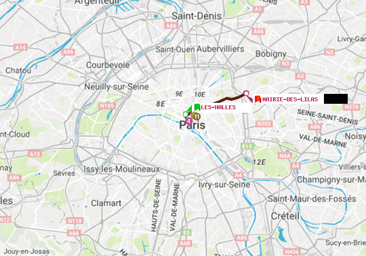 Il n'y a pas de ligne de métro directe entre les stations Les Halles et Mairie des Lilas. Le trajet est effectué en 2 correspondances entre les lignes : ligne