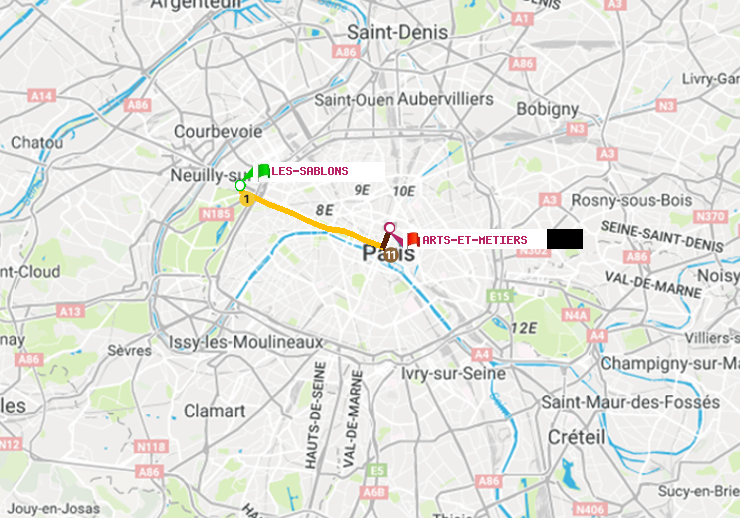 Il n'y a pas de ligne de métro directe entre les stations Les Sablons (Jardin d'acclimatation) et Arts-et-Métiers. Le trajet est effectué avec une correspondances entre les lignes