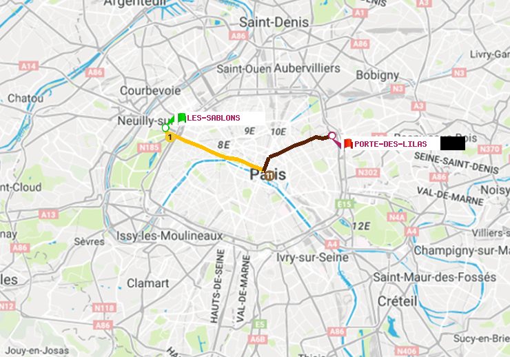 Plan de l'itinéraire métro de Les Sablons (Jardin d'acclimatation) vers Porte des Lilas