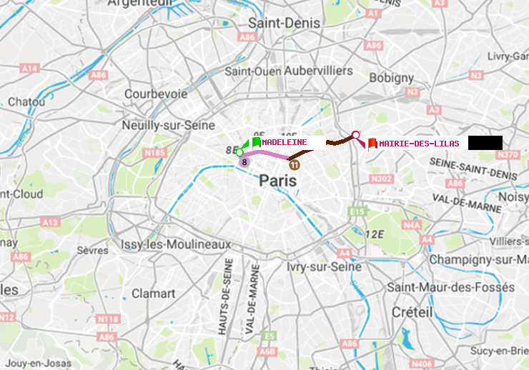 Il n'y a pas de ligne de métro directe entre les stations Madeleine et Mairie des Lilas. Le trajet est effectué avec une correspondances entre les lignes