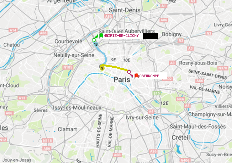 Plan de l'itinéraire métro de Mairie de Clichy vers Oberkampf