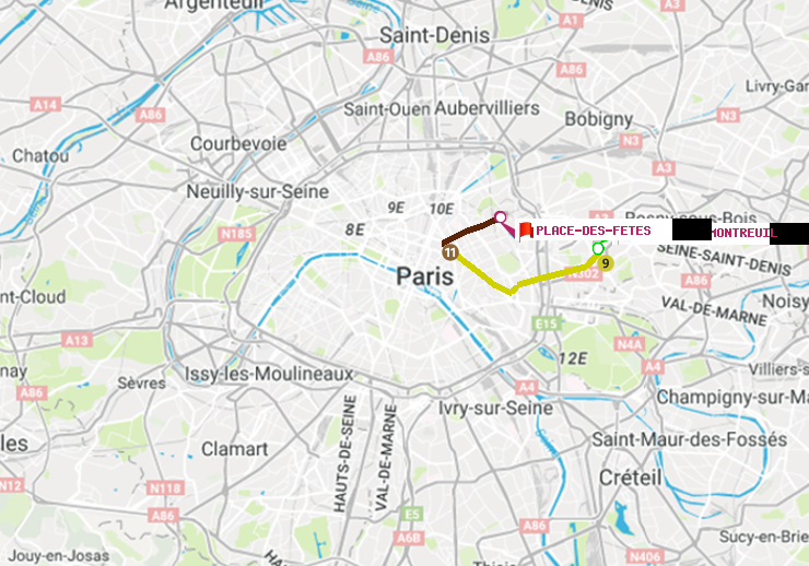 Il n'y a pas de ligne de métro directe entre les stations Mairie de Montreuil et Place des Fêtes. Le trajet est effectué avec une correspondances entre les lignes